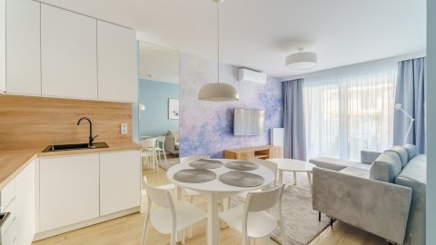 W swojej ofercie mamy również w pełni wyposażone 2 pokojowe, 4 osobowe apartamenty (z możliwością dostawki dla dziecka - łóżeczka). Składają się z części sypialnej i wypoczynkowej – pokoju dziennego połączonego z aneksem kuchennym. W sypialni umiejscowiliśmy szerokie, wygodne łoże małżenskie oraz toaletkę, zaś w pokoju dziennym kanapę i TV. Bezpośrednio z salonu mamy wyjście na prywatny taras. Całośc uzupełnia łazienka w nowoczesnej stylizacji, w której znajdziemy kabinę prysznicową, miskę wc, umywalkę z szafką oraz suszarkę do włosów. Na wyposażeniu apartamentu jest także parawan i koc plażowy.